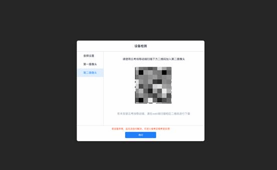 进入候考场之前,考生需要先进行设备检测,包括音频检测、第一摄像头检测和第二摄像头检测。威尼斯官网使用双摄像头进行面试,考生需要打开云考场移动端扫描该页面提供的二维码加入第二摄像头。